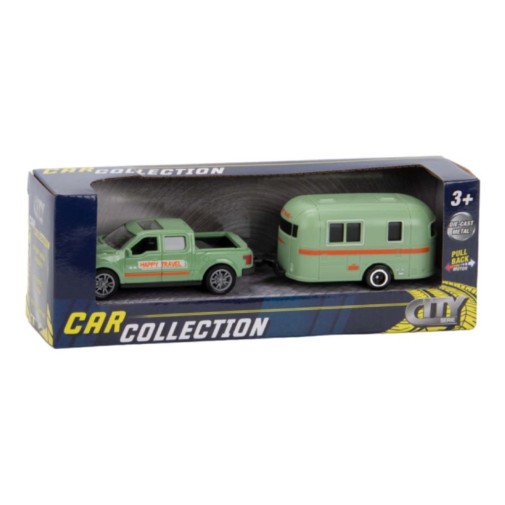 Die-cast voertuig met plastic trailer. Met pull-back functie. Schaal 1:50. Wordt 2 assorti geleverd met pick-up truck of jeep voertuig. Wordt geleverd in touch box. Geschikt voor kinderen vanaf 3 jaar.